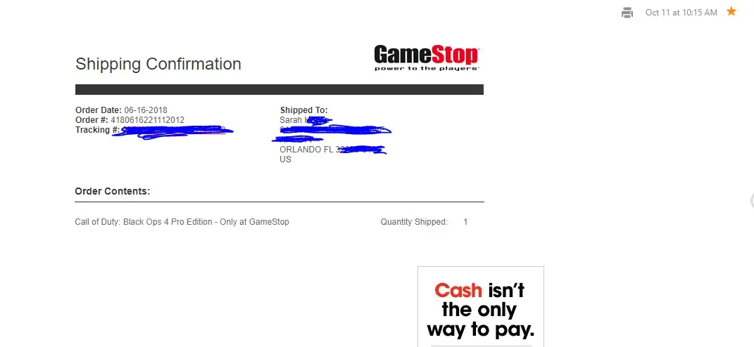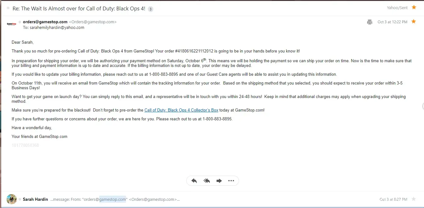 "Thank you so much for pre-ordering Call of Duty: Black Ops 4 from GameStop! Your order # is going to be in your hands before you know it!
