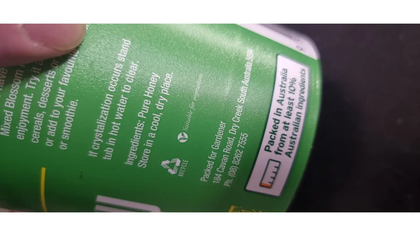 You are confusing it with the Gardener brand. This product I don't believe is 100% honey as it doesn't crystallise on my cool counter in Tasmania, plus it reports only 10% Australian content. Dressed in gold and green and packed in South Australia had me fooled. The regular Tasmanian honey I normally buy tastes like honey and crystallises over time. This has been on my counter for 6 months+ now because we just rarely use it. Normal honey next to it...