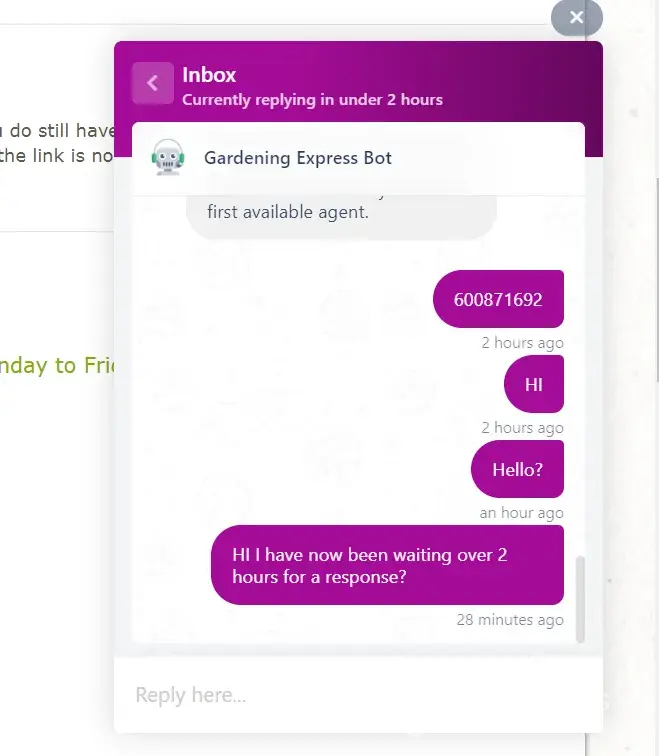 I have tried 4 times to contact Gardening Express via there Web chat facility and each time, after waiting over 2:30 hours (each time) have received no response. There is no other way to contact this Company. In essence, I have paid for dead goods nd am unable to get a response due to zero contact from the Company as you are unable to contact them s no one answers the live chat facility. (screenshots added for this too).