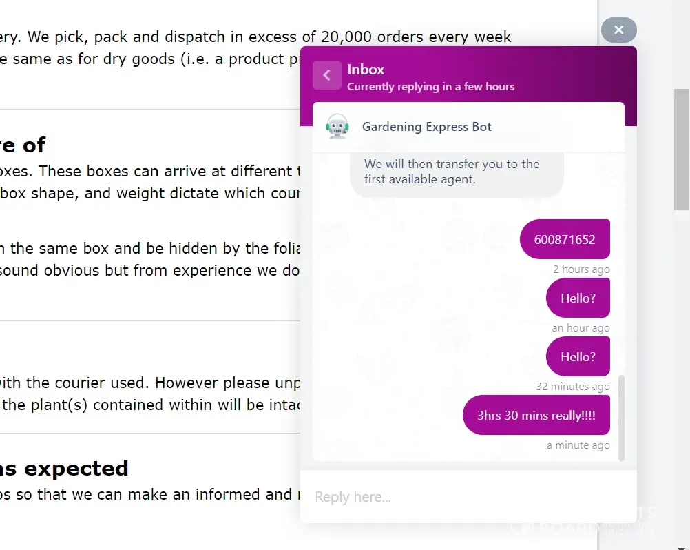 I ordered my plants nearly 3 weeks ago, I have tried to make contact with gardening express vis their ' help bot' which never replies.