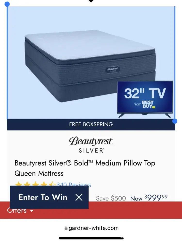 Purchased one of these mattresses to include a free the box spring. You can get a $300 visa card or 32 inch television when I called The receptionist is that that was an old advertisement she stated that she doesn't know why they are still using it! This was a switch$bait. Please do an investigation on Gardner White to warren location off 8 mile road. Please help. My name is Katie Washington Harvey my phone number is [protected] my email is [protected]@icloud.com