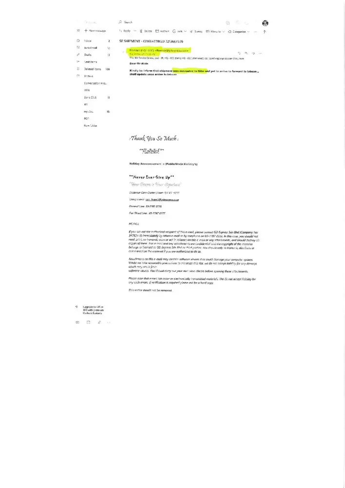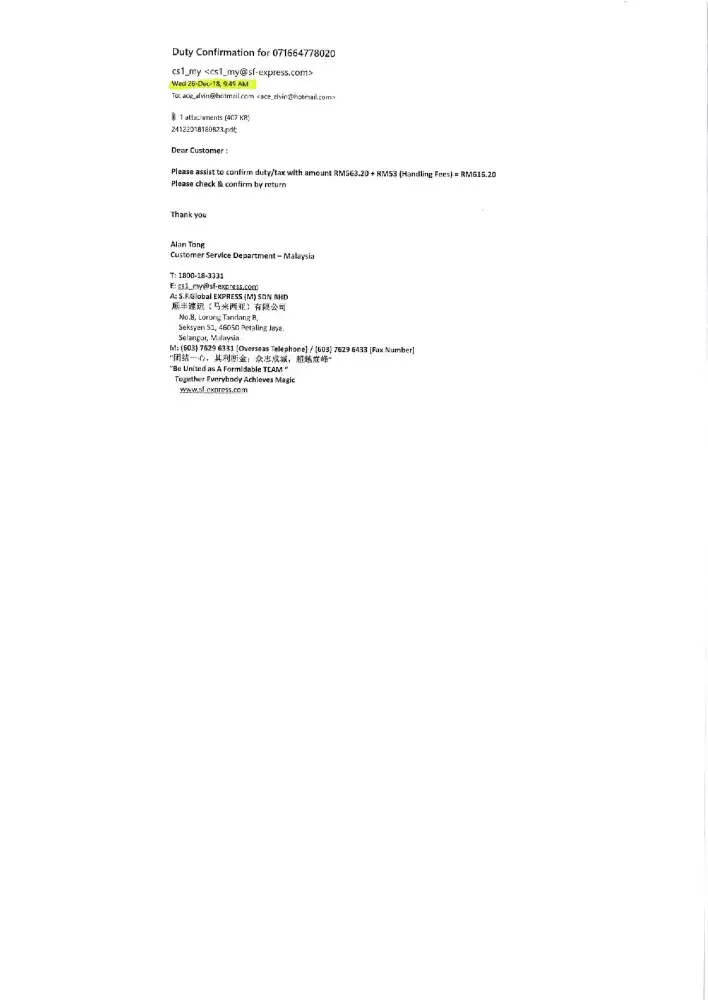 I'm the founder of Borneo Martial Arts Expo, i order 1 championship belt & 300 medals from China for my event B-MAEX dated 28th - 30th December 2018. I been told that my parcel been sent out by using SF Express service dated 22nd Dec 2018. I started calling SF hotline to follow up & told them this parcel need to be send before 28th December 2018. I tried to call almost everyday to follow up the parcel. 26th December 2018, I been told by email & telephone call regards i need to settle the duty/tax & handling fees RM616.20, and shipping charge RM1591 before 3pm so the kastam can release the parcel to be send to Labuan. I had make the payment of RM2207.20 dated 27th Dec 2018, 2:17pm, and i did email the receipt and call them by phone to inform about the payment. 28th Dec 2018, i call GDEX HQ again, i been told that my parcel was miss routed to Sibu. I can't get my championship belt and medals to be present during the welcoming dinner on 28th Dec 2018, i look bad in front of the Guest of Honor, VIPs and the sponsors during the press conference. And i got no medal to present for my whole 3 days event. The service of SFEX & GDEX had ruined my reputation as the founder of Borneo Martial Arts Expo 2018. Until today 3rd January 2019, i haven't receive anything or email notice at all. I need them SFEX and GDEX to pay for my lost in terms of reputation, i need them SFEX & GDEX to compensate me ASAP.