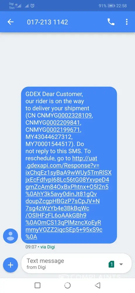 I received this sms this morning gdex dear customer, our rider is on the way to deliver your shipment (cn cnmyg0002328109, cnmyg0002209841, cnmyg0002199671, my43044627312, my70001544517). do not reply to this sms.