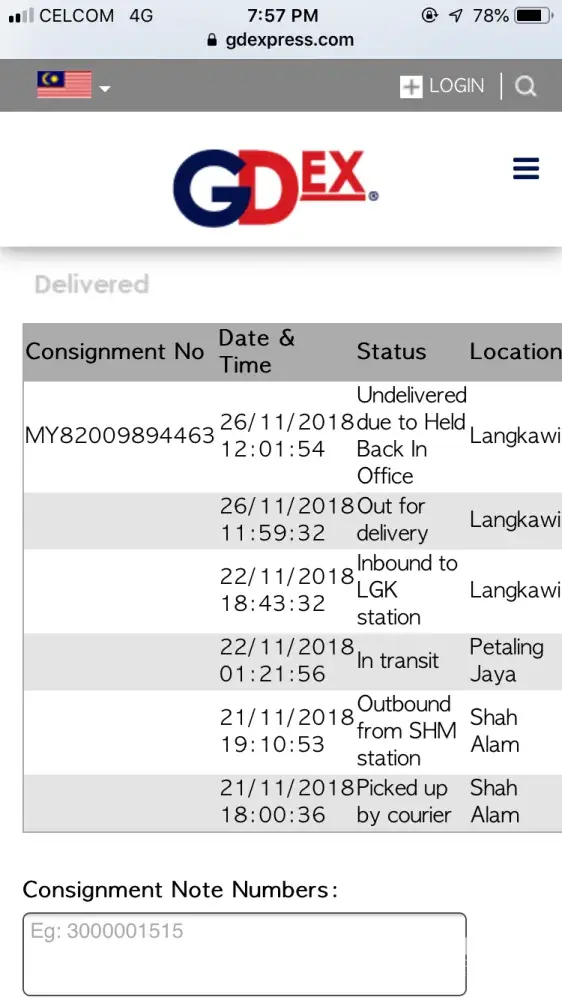 I have made a purchase through Lazada on 27/11/2018. Immediately, the delivery status updated as 'parcel packed and will be handed over to our delivery partner Seller Own Fleet MY'. As I will be away since 30/11/2018, I had attempted to contact Lazada to check the status of my parcel. There was no updates until I received a call from Gdex delivery man on 30/11/2018 that my parcel had arrived. I then requested if I can self pick up on 3/12/2018 which the delivery man said he will arrange for me and the office opens until 9pm.