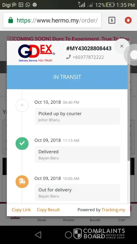 I received a call from GDEX (phone num: 03-[protected]) on 12th Nov 2018 to arrange a delivery on 13th Nov 2018.