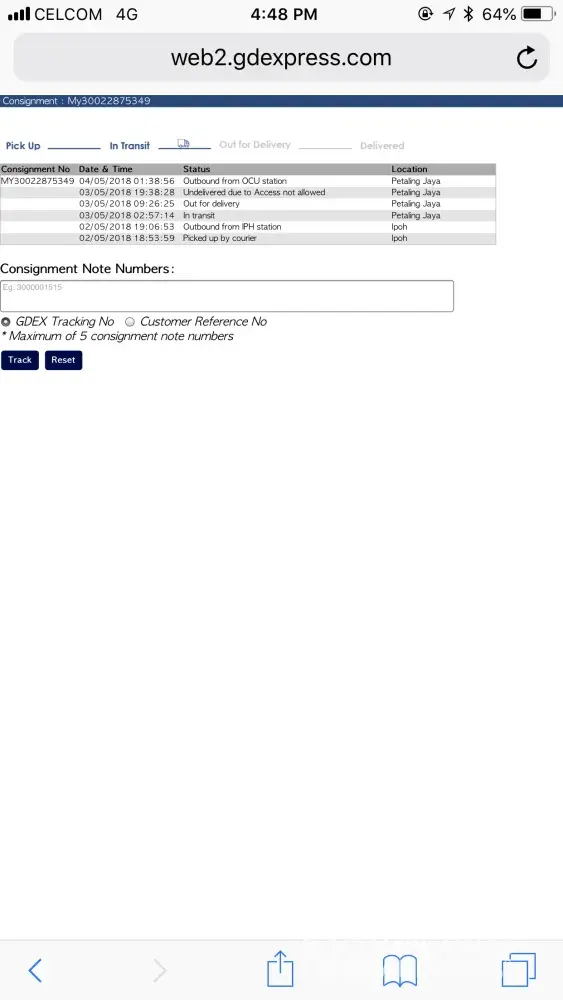 I am not satisfied with GDEx delivery system. Look at e-tracking items out for delivery but since morning to evening time of the delivery day till 10 pm waiting at my house. Guard no call, means surely no one of your Gdex staff come. No update till the next day 4pm today is Friday saw updated that NO Access to my home. bloody IDIOT, can't u see. No note or writing to keep me alert that the item can't be delivered yesterday. What kind of system that u all used actually Hah! Now, waiting at counter, and yet the parcel not knowing where there were! [censored]