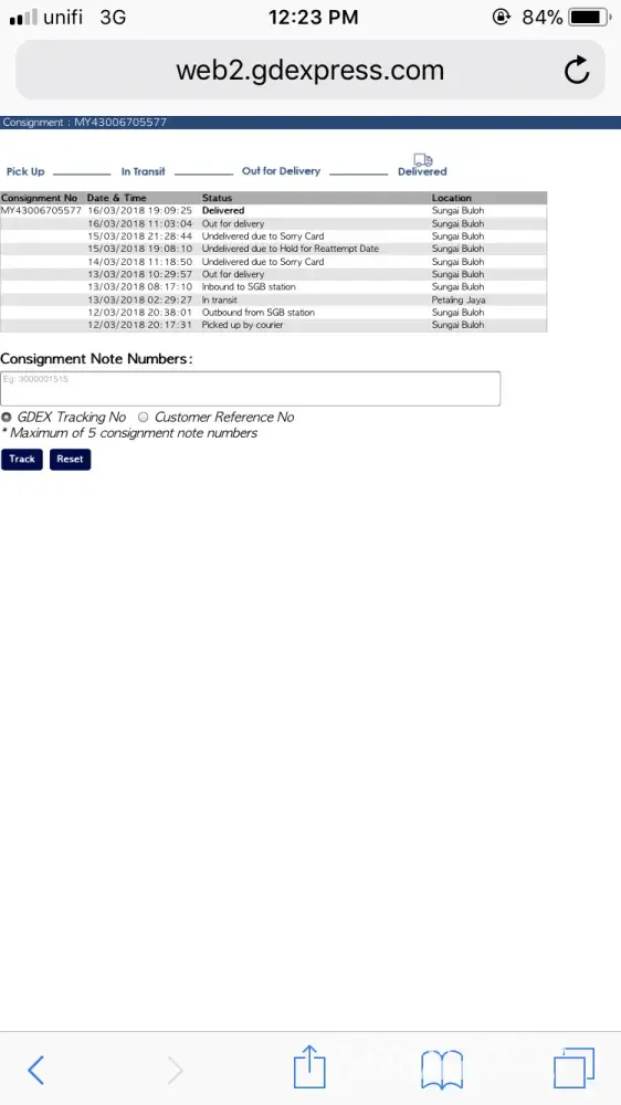 Monday I called Gdex Rawang asking why the dispatch didn't call me when he was in front my house because I was 5 min drive away. She told me it is not Gdex policy to call customer. So I have no choice but go to Gdex pick centre at rawang to collect my item.