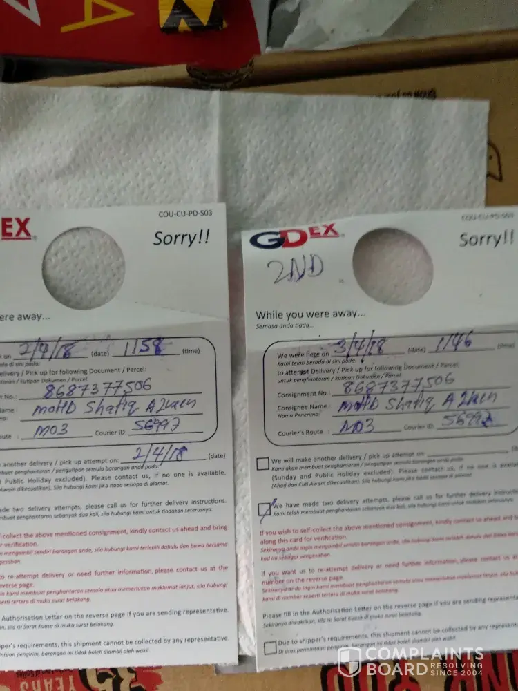 On the 2nd of March, I received a "sorry" note, asking me to collect the parcel at their branch. Also written on the "sorry" note, was also the date of "an attempt of 2nd delivery", which was written "2nd of March" as well. I dont always receive parcels with Gdex so I thought the 2nd delivery was made on the same day. On the 3rd of March, I drove from home, all the way to the Gdex Kuching branch, only to be disappointed, and even more disappointed with the custome service I was given. The male clerk did not at all offer an alternative or slight of help to the situation, and only said to come back the following day to pickup the parcel, at the Kuching branch, which is ridiculously far from where I'm residing. Tho the male clerk called the dispatched delivery unit to confirm his whereabouts, but resorted to giving me the sorry note because no one was at home. I don't think it is my fault that I'm not at home for the 2nd delivery. Clearly, the dispatched delivery unit should take heed the information they jote down on the SORRY note