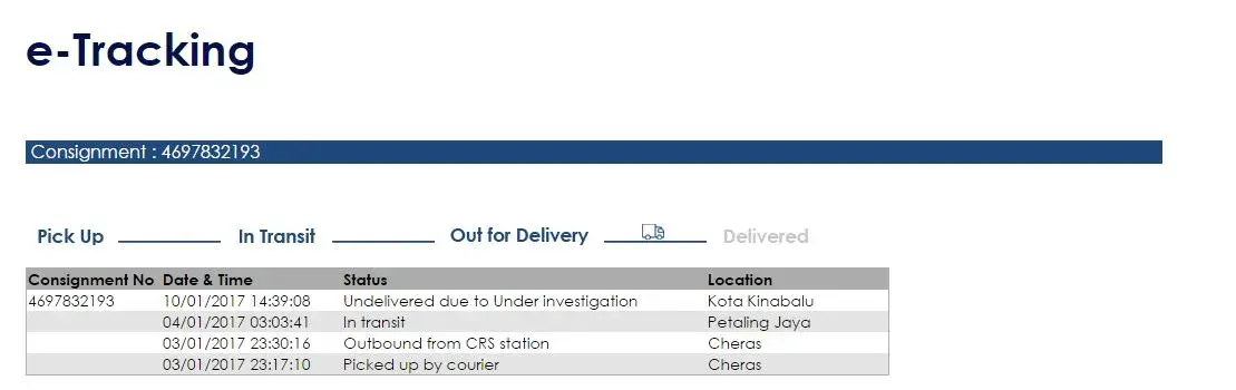 until today 15/12/17 no more update & no more receive any call from courier service. I had called many times to KL office chased my parcel update also didn't receive any feedback from them.