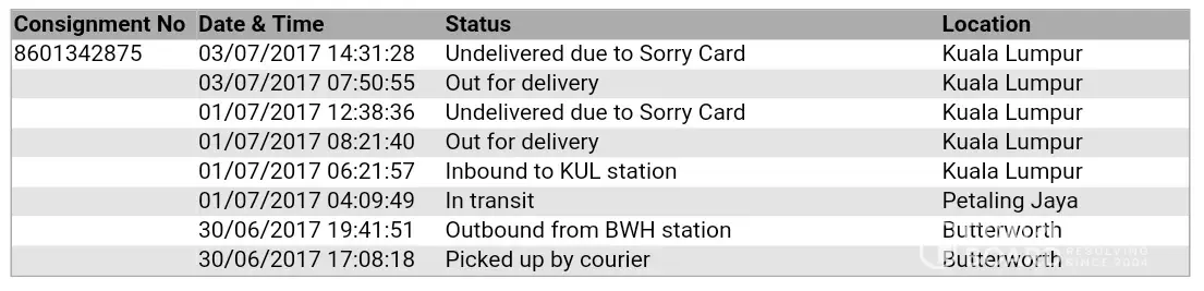 This incident happened in Alor Setar, Kedah. My order was delivered on 28 August 2017 but there was nobody at home at the time so we missed your delivery. We called the number on the leaflet that your staff left us to reschedule my delivery. We were promised by your staff to deliver my order on 29 August 2017. We waited for whole day but your staff did not turn up as promised and didn't even bother to give us a call. We ended up wasting our time waiting for delivery that never show up!
