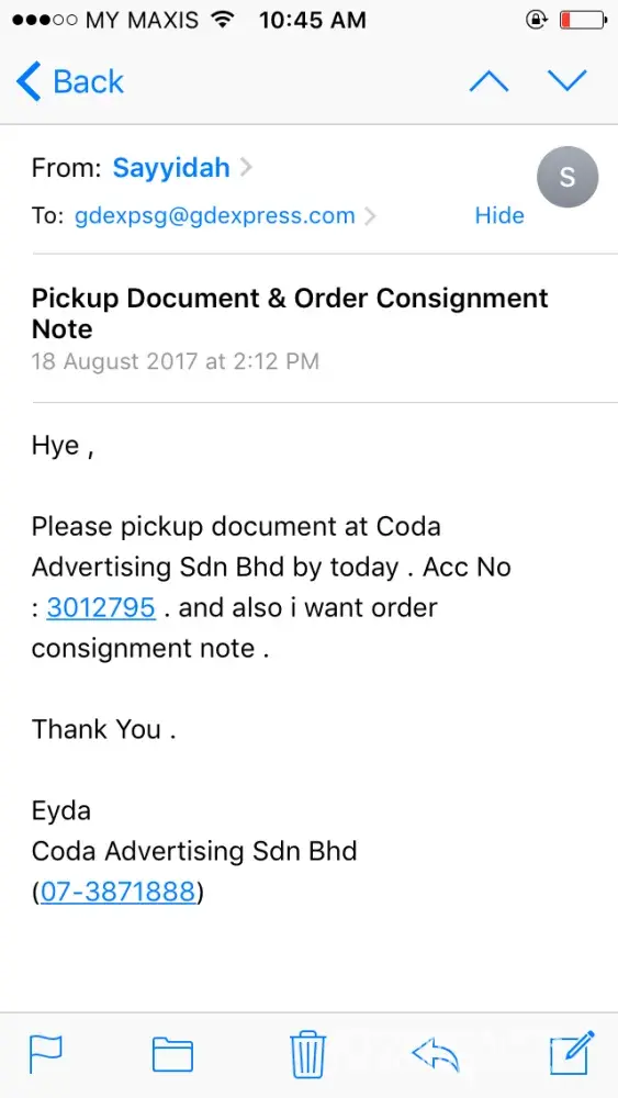 Secondly, the poor and rude customer service that we received when we finally agreed to pick up the order ourselves from your office in Alor Setar branch. When we reached your office, we were treated unfriendly by your staff. We were not even approached by any of your staffs to inquire about our request.