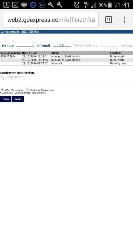 Consignment no.[protected] 16/12/2016 19:37:44 pickup by courier 16/12/2016 04:00:42 outbound from hub to butterworth branch 16/12/2016 19:37:44 collection 19/12/2016 15:10:20 out for delivery from butterworth branch 21/12/2016 12:29:17 out for delivery from butterworth branch 22/12/2016 12:56:41 out for delivery from butterworth branch 17/12/2016 15:02 hold...