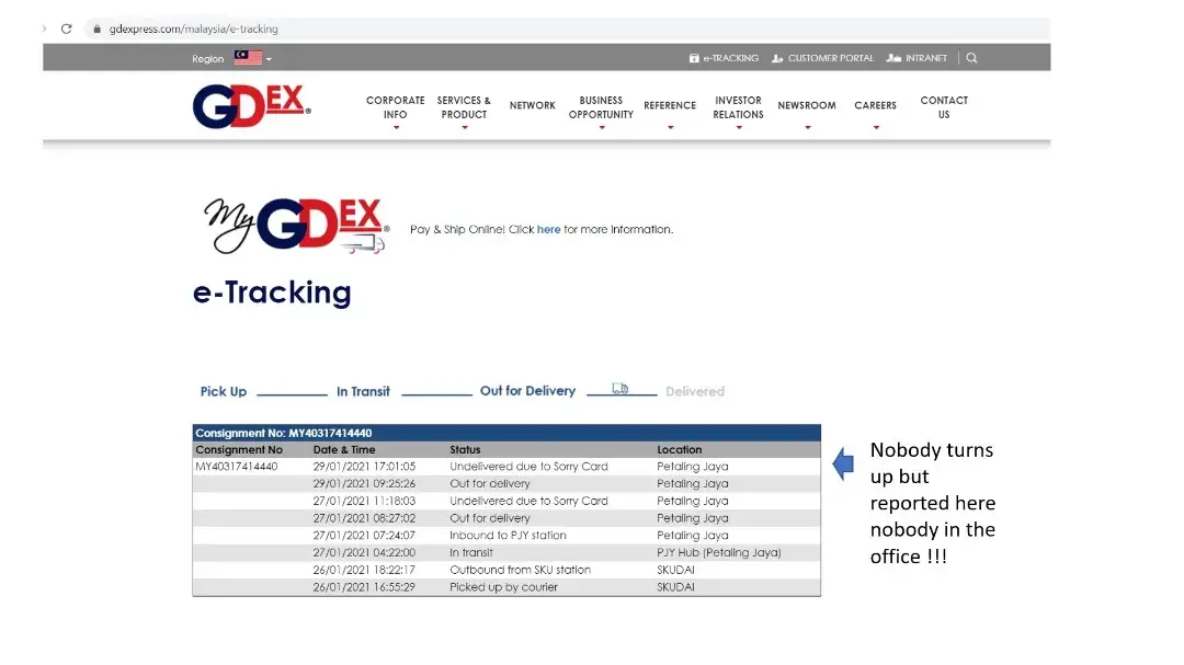I am truly disappointed over the services provided by GDEX. I know nobody will contact us, but the stupid report will be updated "nobody to receive the parcel"
