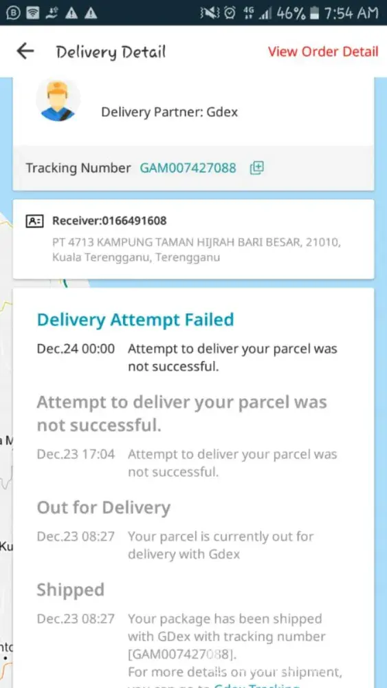 Saya beli barang lazada patutnye 23/12 delivery tapi sampai kan hari ni tidak sampai. Saya pon tidak tahu punca kenapa gdex tidak delivery barang saya. dah col gdex terengganu tapi dorang minta pick up driver tak nak hantar. Katanya hari khamis 26/12 tidak pick up barang tu akan di hantar kepada seller semula. Kalau saya ada kenderaan saya dah pergi pick up masalah bandar terengganu dengan tempat tinggal saya di setiu jauh. Jadi saya tidak dapat pick up saya harap barang saya akan dapat di hantar semula dalam masa terdekat ini