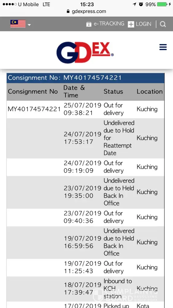I am disappointed with Gdex service especially Gdex Kuching branch. As per the system tracking, my parcel arrived on 19 July 2019 and delivery was not successful on the date and I am fine with it. On the 23 July 2019 still my delivery is not successfully delivery. Until now at 1526 hours yet my parcel not arrived.Kindly solve this matter efficiently.