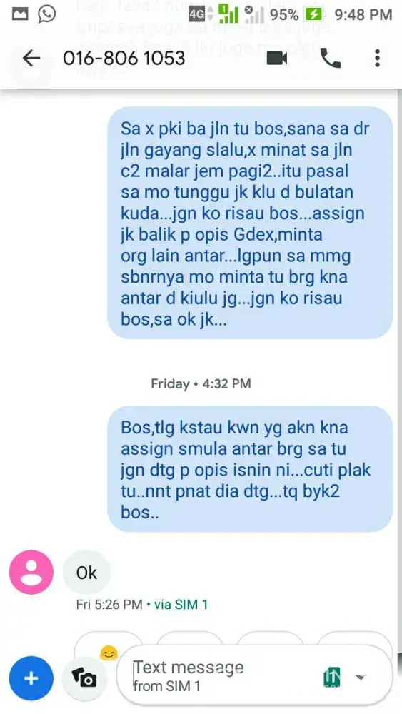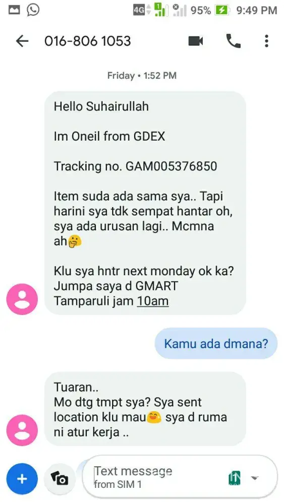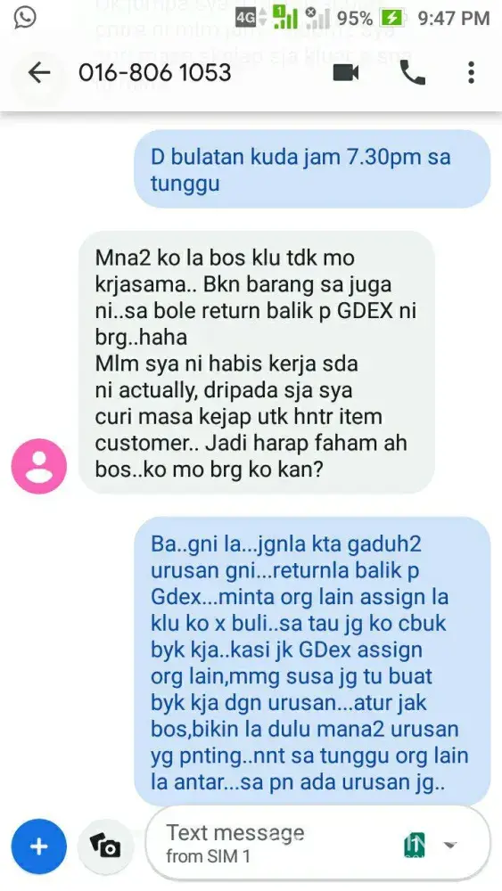 My parcel should be delivered today and your delivery boy called me to deliver the parcel. I did'nt pick up bcoz i'm working n my phone on silent. He message me with no intro by just mentioning 'xnk ambk brg ke'. Did gdex have standardize greeting for customer? If not, you should have one. I called him to explain and tell him to deliver to the customer service at my workplace but he keep asking where is the scott garden, decathlon, jalan klang lama. Such a nunsaince excuses. He told me that the customer service do not receive parcel. He did he know. I also one of the customer service, so I know the procedure. He end the called suddenly when I was talking. I just think maybe he is driving. I think there are ways to solve this matter in good way but personally he is rude. I work in service also so I know how hard to deal with customer but this is not the way. I apologized but this can ruin gdex reputation. Hope action will implement on this matter. P/s : I put my company name so it is easier on your side. No t happy with this situation.