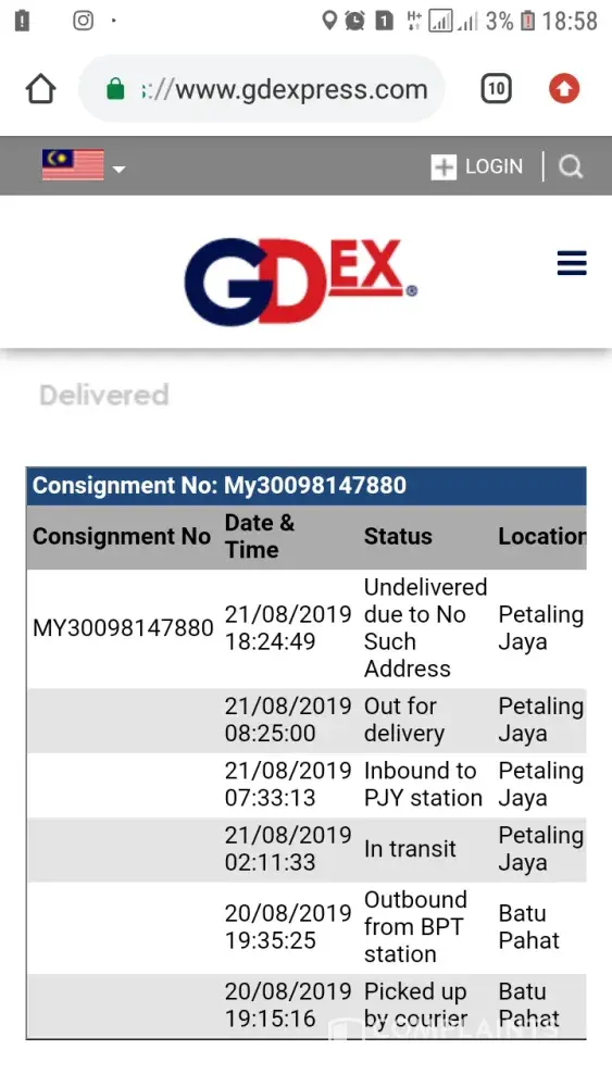 Thank you for very bad service from your delivery boy.I bought the same thing to the same address but now your saying that there no such address.Go to waze please if you said there is no such address.very bad service.VERY VERY BAD SERVICE.I WILL TOLD THE SELLER TO STOP USING GDEX.