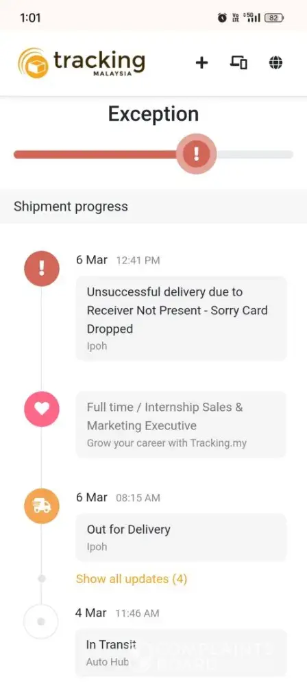 I placed an order and Gdex was the delivery partner. My order arrived Tawau but was not delivered to me. My other order which was placed later, has arrived. I am writing this complaint to escalate my parcel delivery. My consignment number is MY43180942188. I have attached the screenshot of my parcel update.