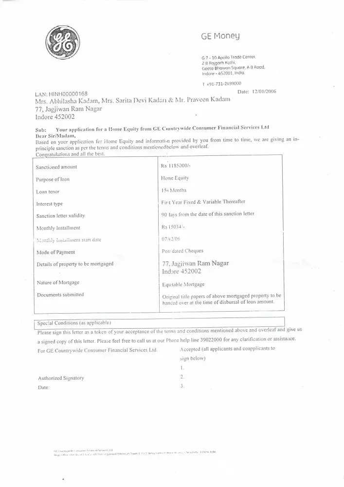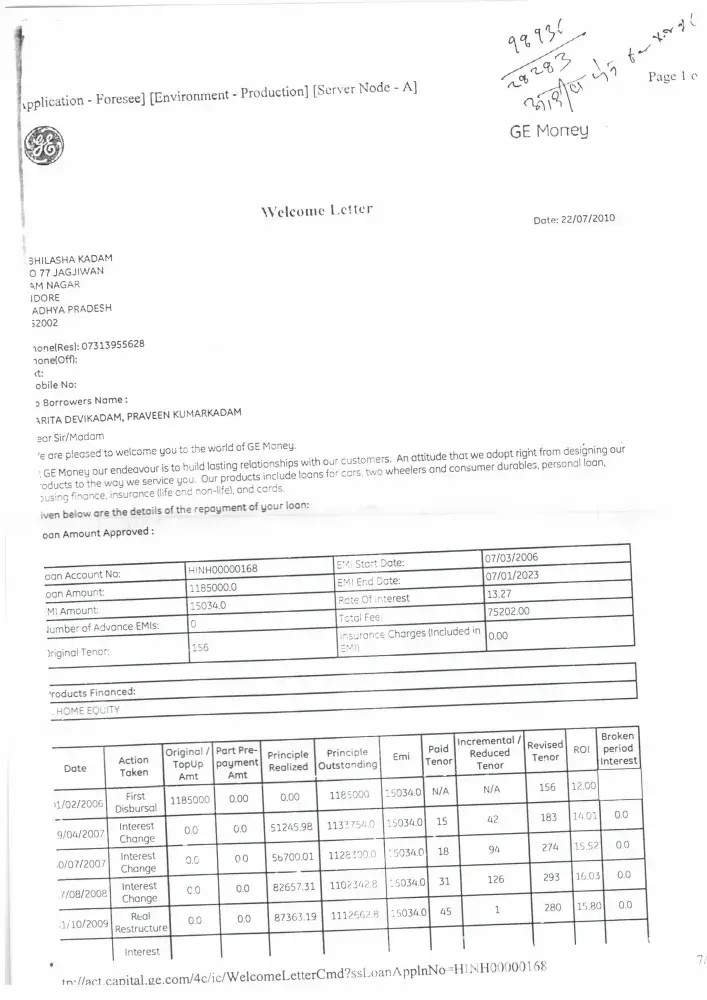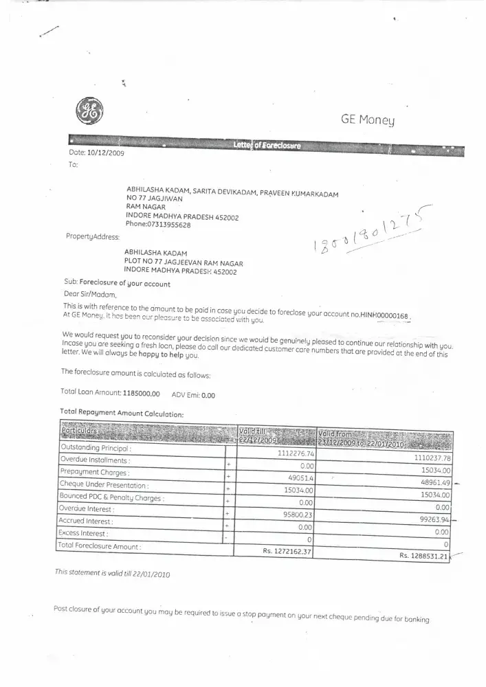 My Mother and Wife had applied for the home loan in the Jan-2006 at GE money, Indore. We got loan sanctioned amount of Rs 11, 85000/- with 156 EMI of Rs 15035.00 would be end in 2023. We are continuously paying the EMI from March onwards till date we had paid amount Rs 7, 96, 855 ( 53 EMI ) . Now we want foreclosure of the loan for which we had applied in the month of November-09. The GE money has given foreclosure of loan at Rs 12, 88, 531.00 and they have renewed the date of loan ending from 2023 to 2033.Kindly find the attached scanned documents and Need your urgent support for solution.