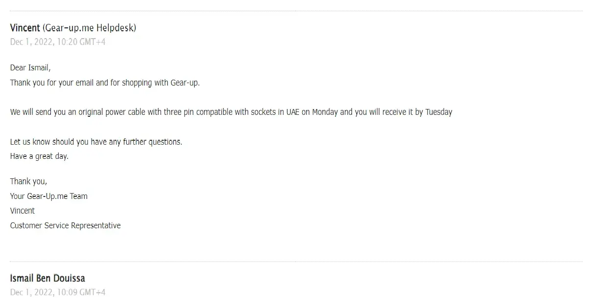 Very bad customer service. They promised to send a charger compatible to UAE but nothing received.