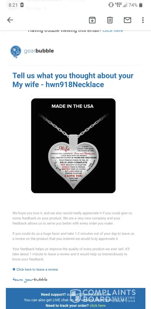 I've been trying to get ahold of you guys for almost two weeks now. I've been sending you guys emails and I get e-mails back saying that you guys had closed my request twice all I want is for you guys to send a new necklace to my daughter and I want a full refund. I ordered the necklace saying to my daughter and you guys end up sending her a necklace saying it was from a grandma what is it going to take for you guys to respond to my emails and my request I don't really want to try to get a lawyer involved because you guys don't want to respond and take care of your customers