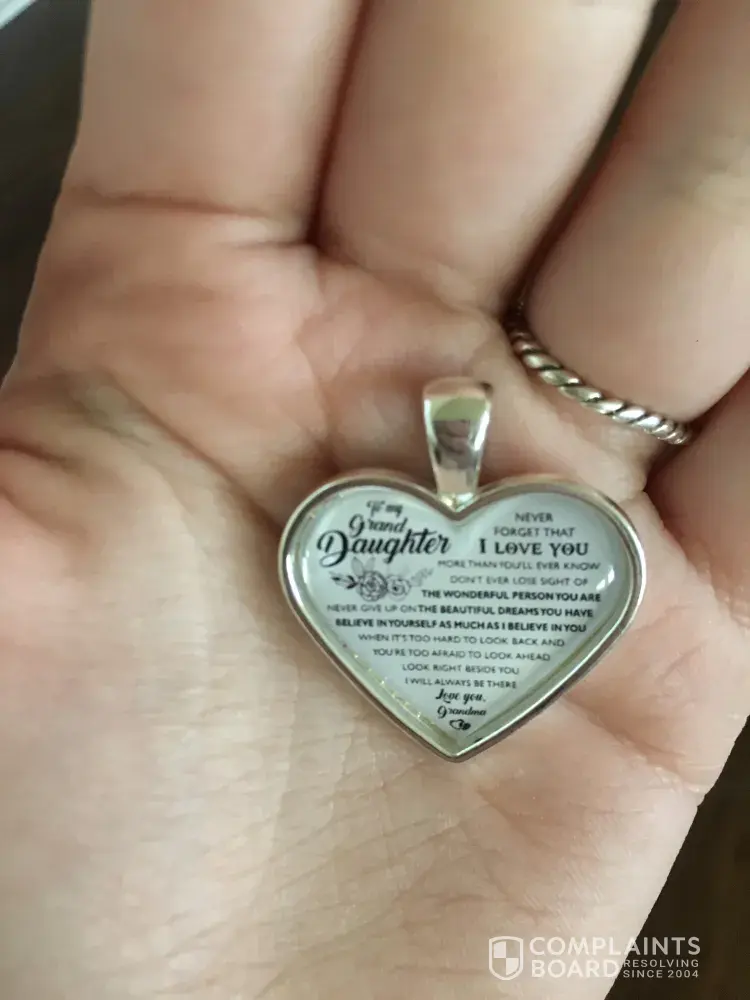 When I first got to see this add on my Facebook page, I was honestly taken back on what was written on the heart! I just received the necklace today and could't be more disappointed! You can't even read anything written on the heart without a good magnifying glass, being it is written THAT small! I tried calling to complain, but they aren't taking anymore phone calls anymore! With the [censored]ty rating this company has and the amount of complaints, than it makes perfect sense to my why they don't pick up the F-ing phone This company sucks and scams you to buy from them!