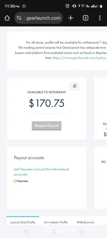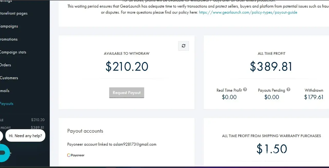 I earned $210.20 profit from actual customer orders on my GearLaunch store (printmytusa.shop). After the store was closed, my earnings have been left in “request†status and have never been paid out.