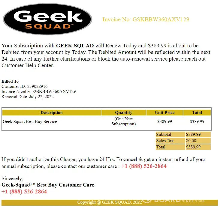 Yesterday, August 16, 2022, I received an email informing me that: "We send you this email to inform you that your servic with Geek squad has been renewed successfully. All details for your service are mentioned in this email. Out team is trying to contact you for this renewal but they didn't get any response from your side. so the service that you use earlier that renews automatically." The language here is a quote from the email I received. These are not my mistaken typos.