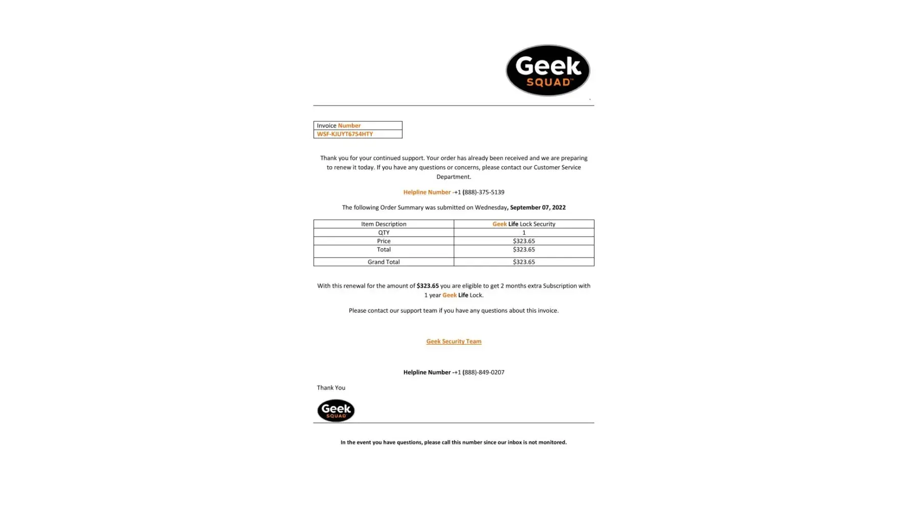 The email goes on to say that the renew order ID (again not my typo) is GE489265926512EK; Details of software: Geek Squad security software; Service Period 1 year; Paid for Renew Service $399.99; Activation code #INV4386740967263DER.