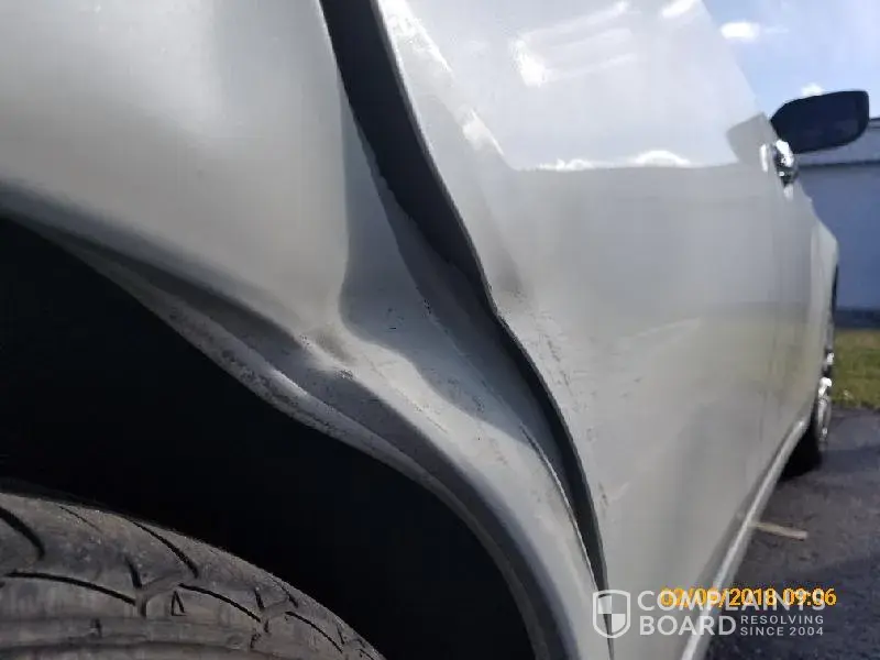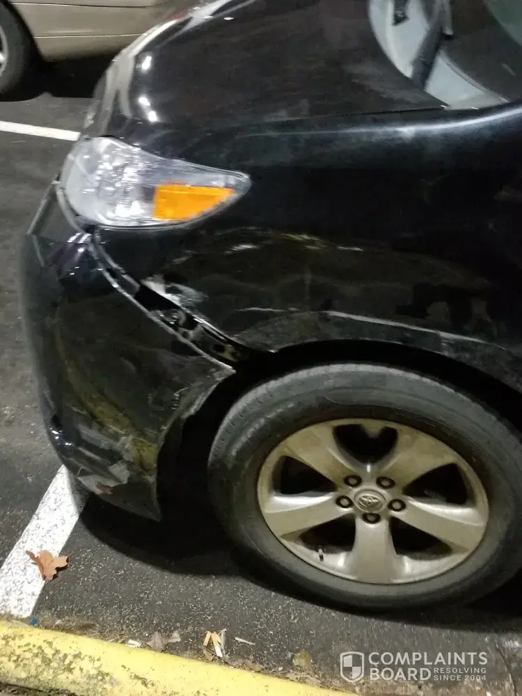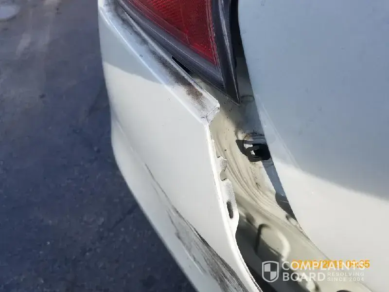 1) Car: rear bumper with visible several minor dents and multiple horizontal minor cracks, with its right side detaching from the body by 0.3 inch; unknown damage beneath