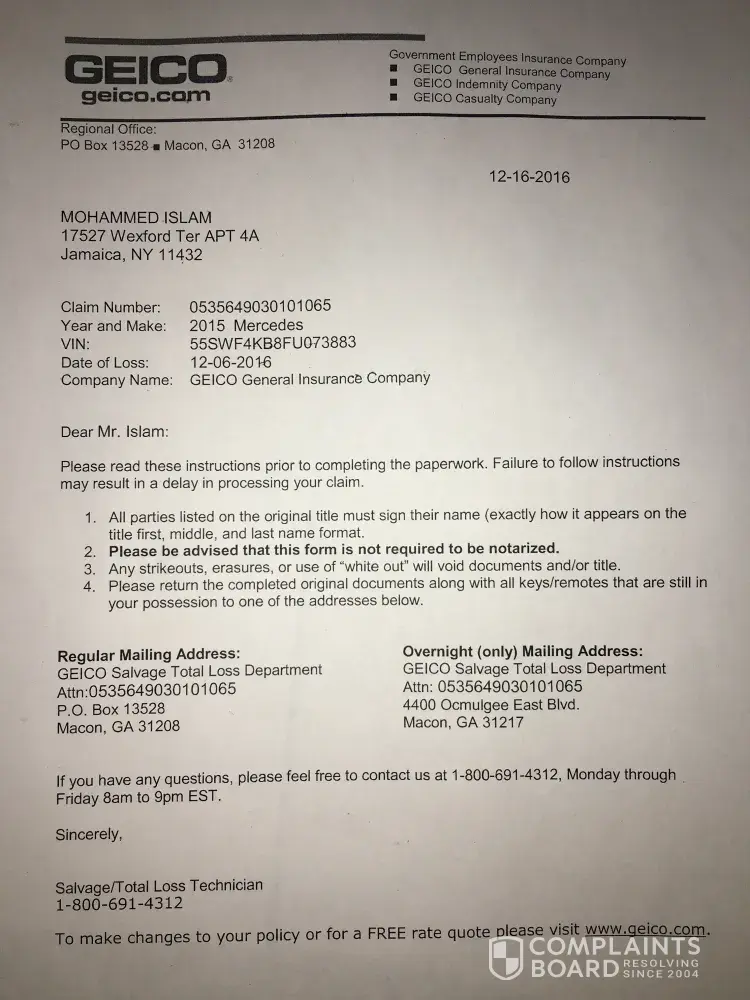 My car was totaled on December 11, 2016. I spoke with Eric Warden the days following the incident, and the last I spoke with him was December 15, 2016. He was supposed to send me a form to give power of attorney on my vehicle, and I was told to expect a call from the salvage department. I never received the form from Eric Warden, nor the salvage department. I have left countless voicemails and sent a message through the Geico.com website to discuss getting some additional document from him to file my gap insurance claim.