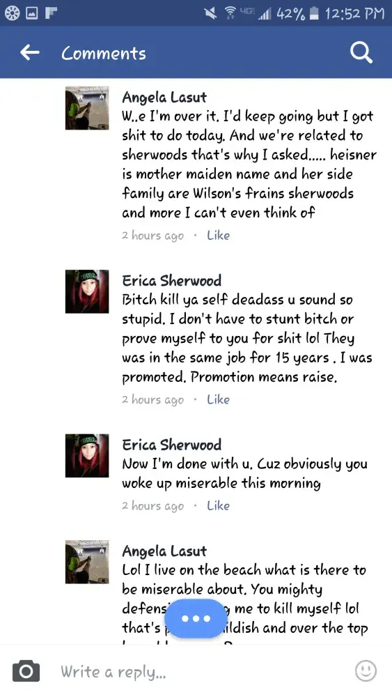 Erica Sherman is on Facebook announcing she is a geico employee and in process of her representation of the company she told myou sister to [censored] and went to the extreme knowing our uncle and cousin committed suicide I have thought about printing out the picture and mailing it to corporate and local news channels immediate action should be taken on this bragging cyber bully employee.