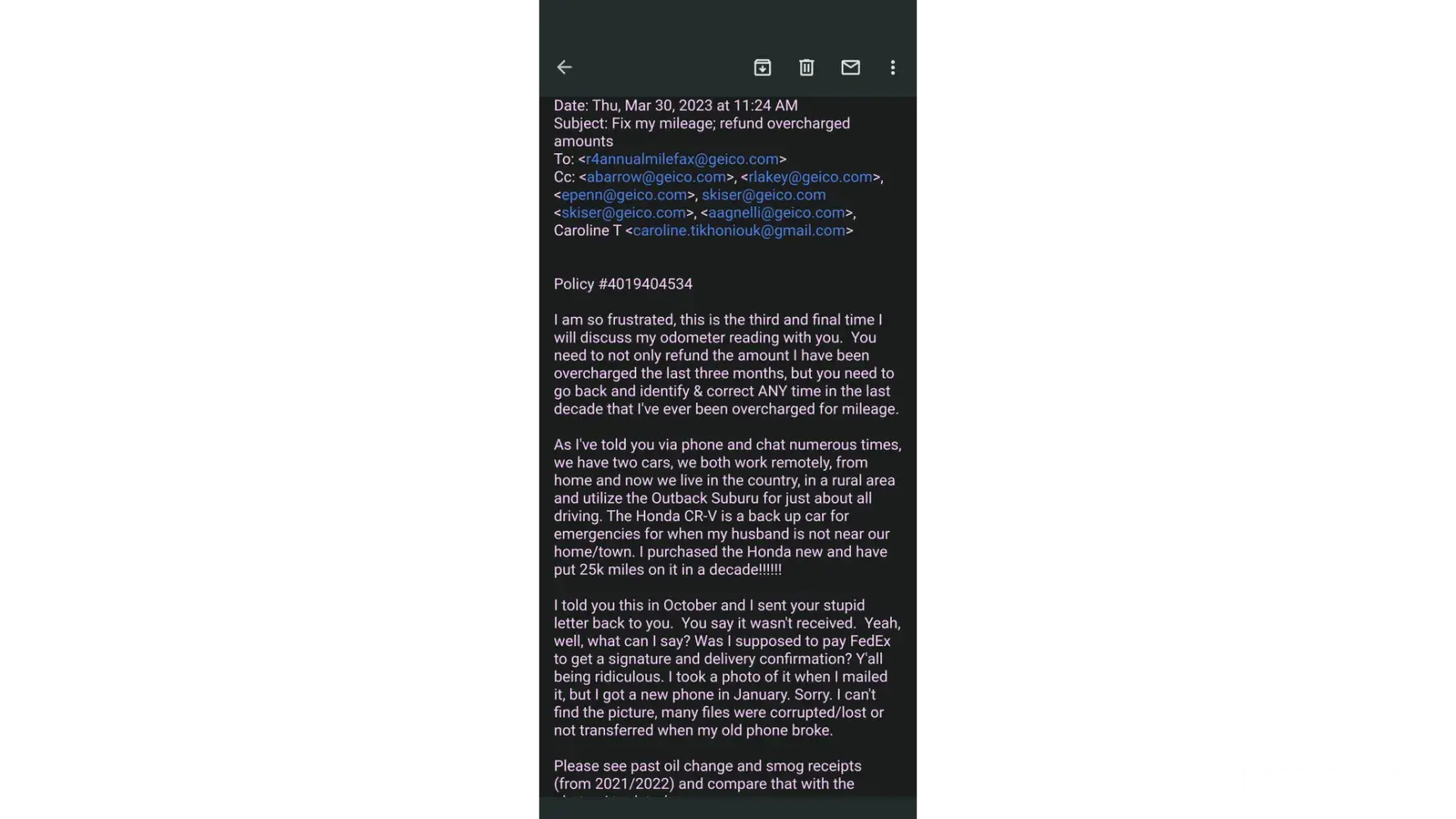 For the last couple months, I've been emailing them photos, oil changes, smog certificates and I can't even get an acknowledgement to any of my emails.