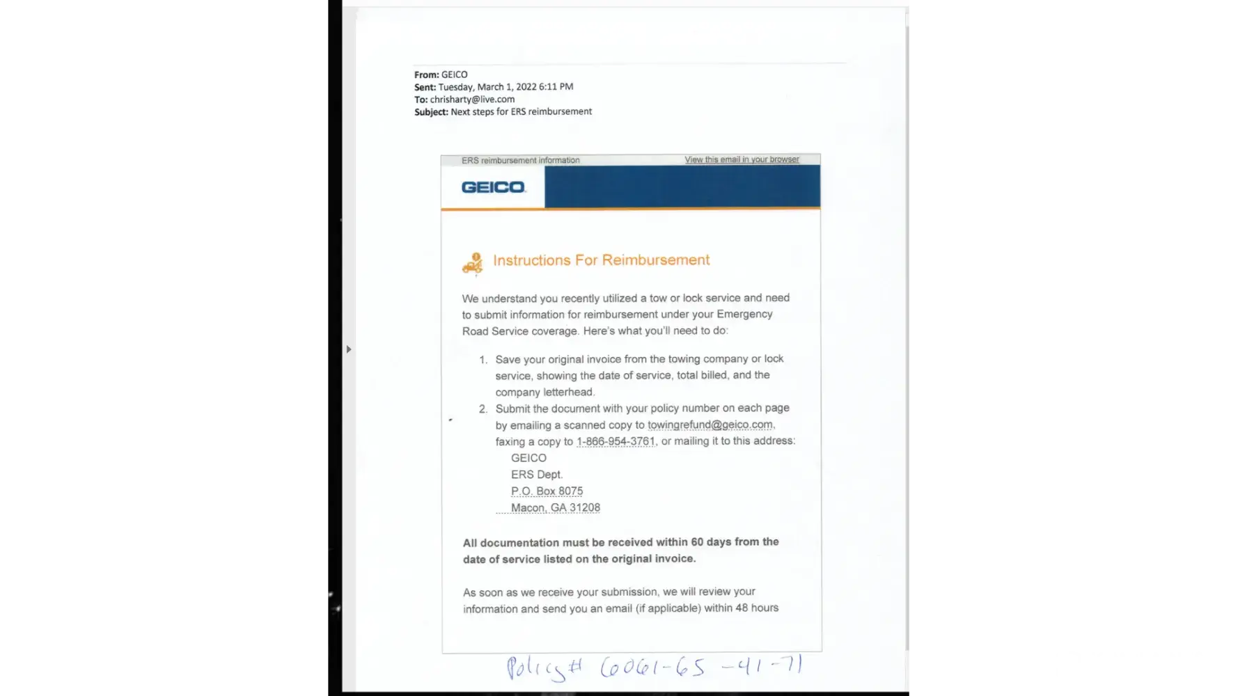 Desired outcome: Reimbursement for the $250 towing bill. I already sent in my receipts to their [protected]@geico.com and also sent it to their P.O. Box via surface mail.