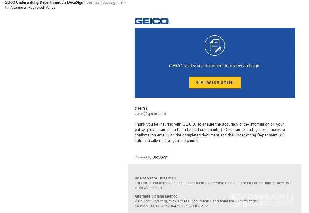 I keep getting mesages saying "GEICO sent you a document to review and sign" from GEICO Underwriting Department via DocuSign. A copy of the email is attached below which is all I have regarding their request.