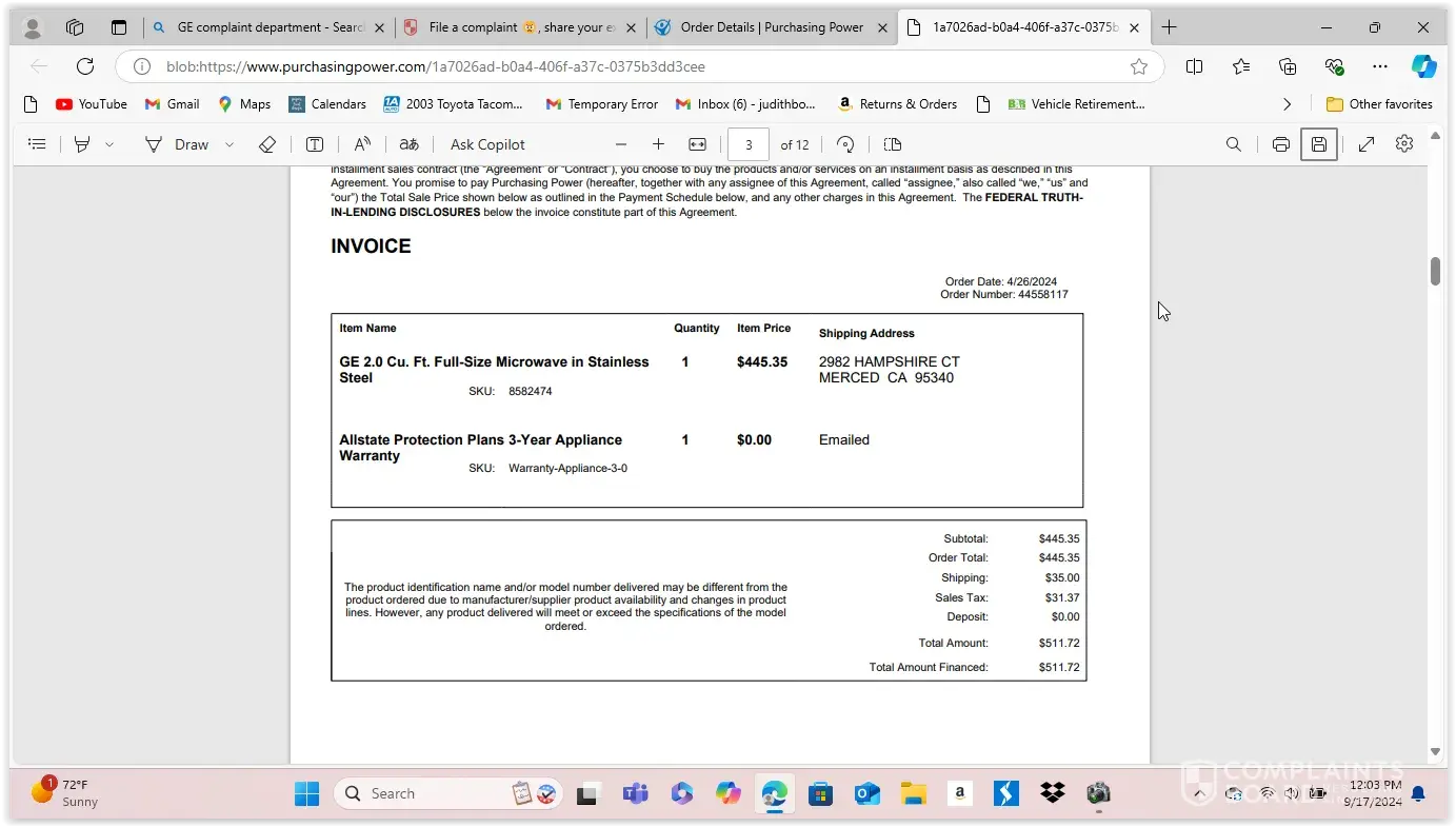 I purchased the above referenced microwave from Purchasing Power on April 26, 2024. Serial number A2202758L Model#JES2051SN5SS. My case #[protected]. I paid $445 before taxes. I was told to buy a microwave and I would be reimbursed. I was told a voucher would be sent to me for the microwave. I did purchase another GE microwave locally from Best Buy a smaller...