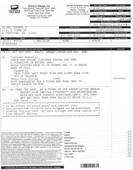 On August 17th I purchased a new 2019 Envsion from Drivers Village 5885 Cir Dr E, Cicero, NY 13039, It had 115 miles on it, However before I took it home the rear tire was low on pressure which I found on my Buick ap, So the dealer checked all and put air in the tires . On the way home I felt a vibration in the vehiicle, NOt thinking nothing of it thought maybe it was because it was sitting, On august 19th I called and scheduled a service appt for august 23, I took the car back into the dealer which is 72 miles one way from home, The service tech drove it along with 2 other and said they could not feel anything, I told them I would not have wasted my time if I did not think something was wrong They told me to wait until it had 1000 miles on it because gm would not cover it. If I wanted them rotated and balanced I would have to pay for it myself.