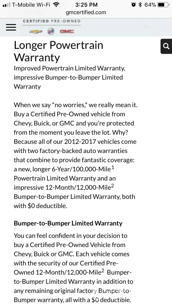 I purchased a used CPO vehicle from a Chevy dealership 2 yrs ago. On 1/3/18 it refused to start.I assumed it was the battery due to the sever cold and had it towed to a mechanic. They checked the battery, starter and alternator. All 3 were fine. They did a diagnostic and found it was the timing chains. I looked on GM's site and saw they advertise a "new longer" Powertrain warranty(6 yrs/100, 000 miles). I called GM, 3rd party warranty companies and the GM CPO dept (Ron) They looked into it and said I would need to contact the dealership I purchased it from to have it added on my vehicle. I met with the GM (Steve) and service manager (Jack) on 1/23. I eventually had it towed there for them to diagnose. I was told my engine was junk and GM would only pick up 30% of the $10k it will cost. I had it towed back to where it was originally and have tried to resolve via social media. I was given 2 diagnostic reports as the first one stated this happened due to "neglect" which is impossible. Jack apologized and corrected it to state the true issues all which are NOT my doing. They keep passing me around and are falsely stating on their website they stand behind all [protected] CPO vehichle and arent afraid to show the faith they have in their cars. Funny thing is I have not had one person take me seriously. I am just being passed around from GM to dealerships to Chevy and on and on. I have documentation and pictures for everything