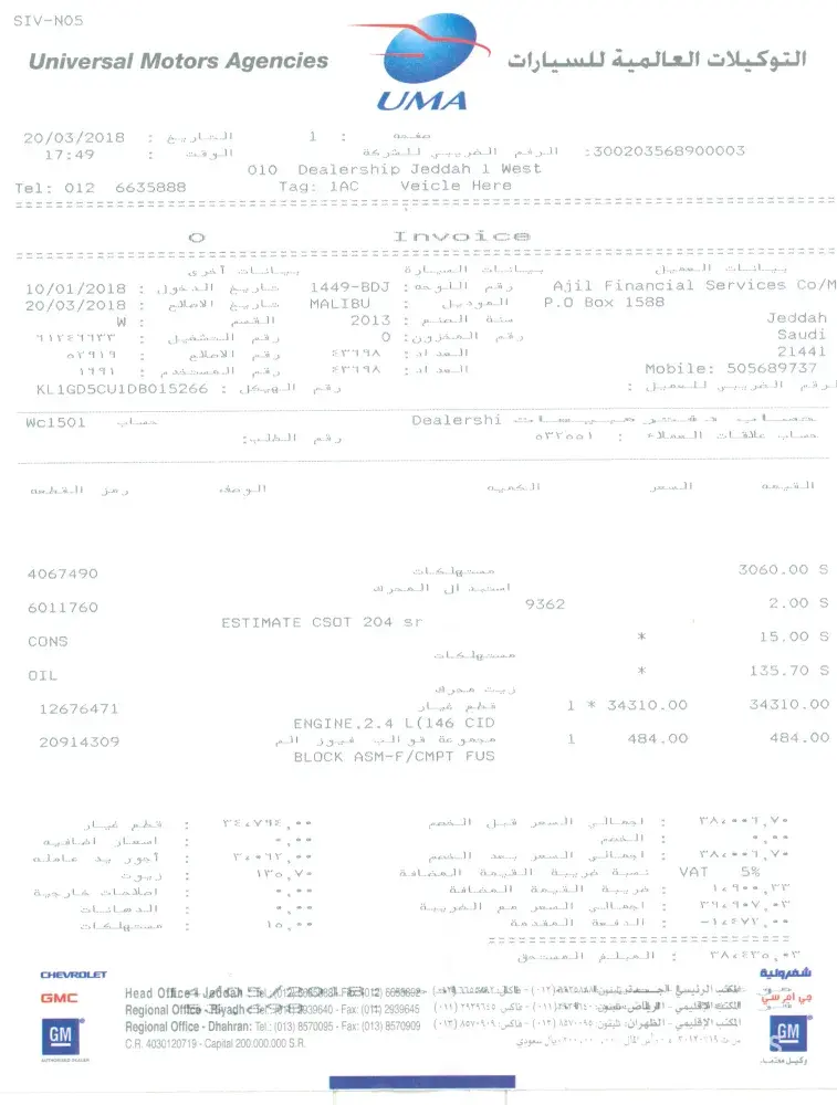 Dear Sir / Madam, Good day, I am Projects Manager in Marine Services Co., Ltd, Jeddah Saudi Arabia. We own several GM cars and as Company's policy our cars are serviced only by authorized agents (in this case Universal Moters Agency).