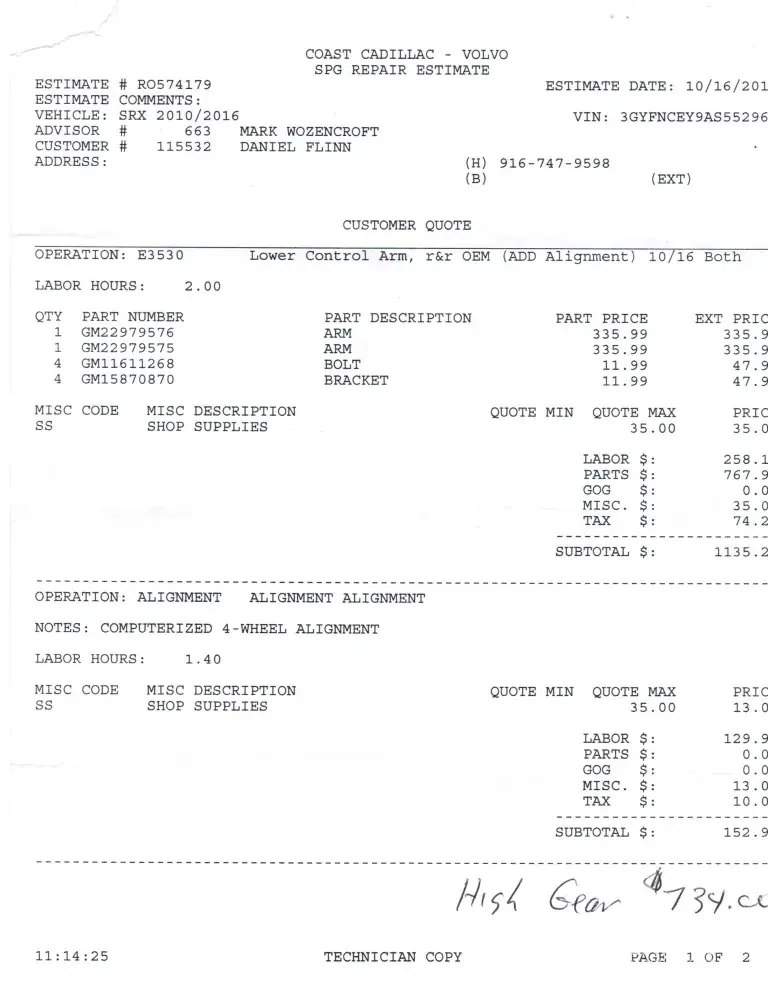 Cadillac has quoted us a price of $1287 to replace these control arms (see attached file). My wife and I are retired and on a fixed income. This represents a huge outlay for us, especially as we expected a Cadillac to last longer than this.