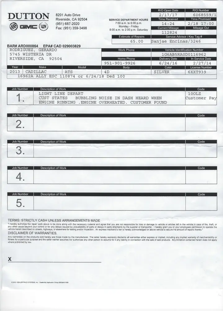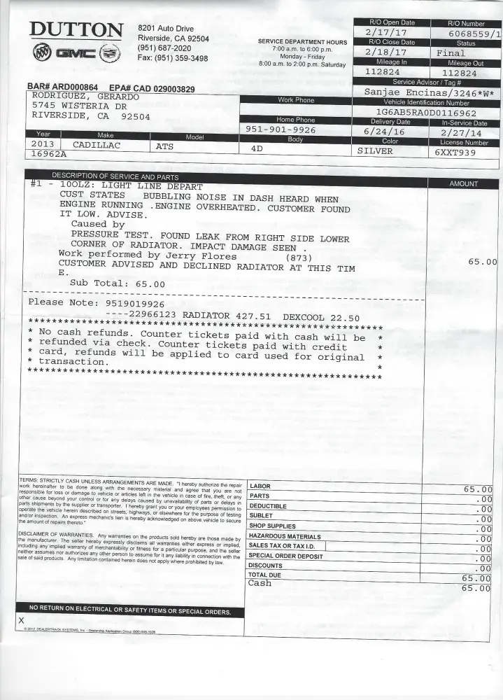 I purchased a used 2013 Cadillac ats from one of your certified dealers in Riverside California on June 24th 2016 under the impression that the car was in good functioning condition, shortly after owning the car I started to notice it would smell like coolant and would sputter while driving almost as if it were on the verge of stalling or cutting out, when I took the car into the dealer for an oil change they informed me that they could not find a leak in the hoses and the car was fine and these engines just ran rough, the coolant smell continued and soon I would sporadically see the check engine light turn on, on 3 different occasions I had called and informed them the check engine light had come on and they told me to bring it in, the only problem would be that after a few hours or sometimes a day or two the light would turn off before I could take the time off work to take it in while the light was on as I was told nothing could be done if the light wasn't on, on 12/05/2016 the check engine light turned on and I called off work to finally attempt to fix this problem, I was informed it was an exhaust cam solenoid and that was replaced under ally warranty, the problem continued and even got worse after the replacement of the solenoid because soon after that happened I started to notice it would eat more coolant and the coolant would bubble in the reservoir overflow, when I took the car in again for an oil change I informed them and they told me that happens when the coolant level is low and If I added coolant it would fix the problem, I stayed on top of the coolant issue and the bubbling did stop for awhile but I noticed the overflow would fill up to the top and not re empty out when car would cool like in previous cars I have owned, I continued to drive car until it finally overheated and I had to stop and wait for the car too completely cool down, I took car back in on 2/17/2017 and told them the problem with the coolant had gotten worse and asked them to run a test to see if it was a blown head gasket or a leak in the cooling system that has been causing the problem, I was informed that the car had a crack in radiator on the bottom right side and that was causing the coolant leak and the bubbling in overflow and it would be a 1300$ fix, it didn't make sense to me because the way the coolant was disappearing it would have had to have dripped on the ground when parked and ive never seen a puddle when id park the car. I took the car to a shop half a mile from my house and they informed me the car did have a leak but not where the dealers compression test had originally shown, the car was leaking on the top left hand side of the radiator not the bottom right as they had informed me at the dealer, i had to pay 900$ to get it fixed. i got the radiator replaced and topped off with coolant and yet again i noticed a significant drop in the coolant level but was told by the dealer to test drive the car and to take it back to them if it continued and that theyd only charge me half the amount they usually do to diagnose it. i drove the car for two days while carefully monitoring the gauges for any inconsistency, on Saturday morning a little past midnight the car sputtered and completely died out throwing up the check engine light, abs, traction control and a few other things all at once, when i attempted to restart the car i realized i had no control over anything electrical in the car and the brake and gas were stiff and i was unable to shift into neutral to move the car to a safer position. The car was towed to a nearby dealer where i was told by the service technicians that my motor had completely locked up and they cant seem to figure why, they told me they originally believed it was an electrical issue but after testing it the starter, alternator & battery appeared to be fine. after extensive research on forums and complaints about the car i found that i was not alone and this has happened to multiple people with the same car with the end result being a motor replacement or dealer buy back, i then got an uber to the dealer i originally purchased the car from in an attempt to get them to fix, trade or buy back the car because it was faulty from the beginning and the car fax even showed multiple visits to the dealer by previous owner for engine idling and to get cooling system checked all of which i was told was "basic maintenance" when i originally asked if the car had any issues before buying the car in the first place, they told me there was no proof and the most they could do would be to pay half of the cost to have the dealer where it is currently at inspect it unless i had it towed to them myself out of pocket($560) and they would inspect it themselves, i don't see why i would have to pay to get the car fixed when i have done my part as the owner to inform them of the issues and take the time off to bring the car in for them to not do a thing about it, this is a well documented issue with these cars on online forums with multiple people complaining about the same thing, i have kept my cool throughout the entire process because i love the car and my family has owned multiple gm vehicles but it is really disgraceful that even when providing them with proof of the problem and even examples of it happening to other vehicles of the same kind i get blown off and left 20+ thousand dollars in debt for a car that was sold from a certified dealer, this type of behavior would be expected from a random scammer on the street but not from one of your certified and well known dealers. i would have been happy if they took the time to actually look at the problem and what other dealers did to fix it but even after showing them profit was a common issue but i was blown off, i really wish someone at a bit higher level would reach out and help me resolve this issue, i still love and believe in GM's quality of vehicles but i know that not every car off the production line comes out to expectation, i feel a 