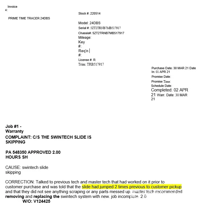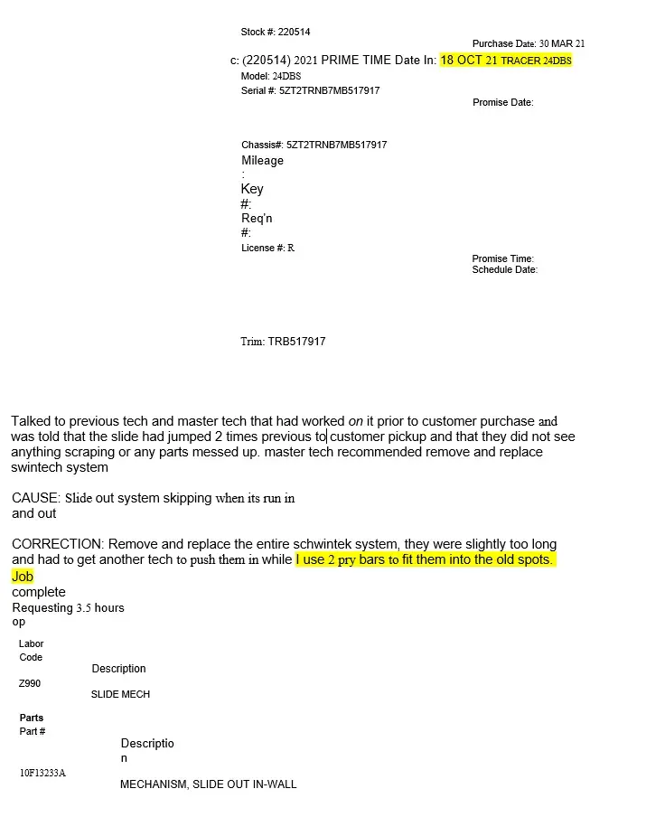 On 2/18/2025 we took our RV to General RV in Fort Myers to get warranty work done. On 2/20/2025 the service dept said that they needed to replace the slide rack and sent to warranty department for the OK so parts could be ordered. I spoke to warranty department and they had no authorization for the work as of yet. I sent emails to General RV asking for Call...