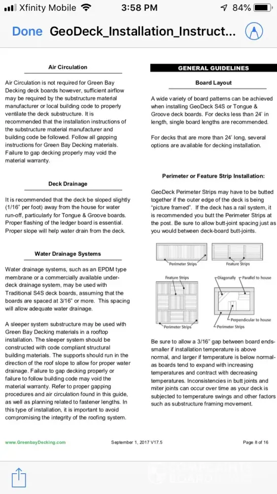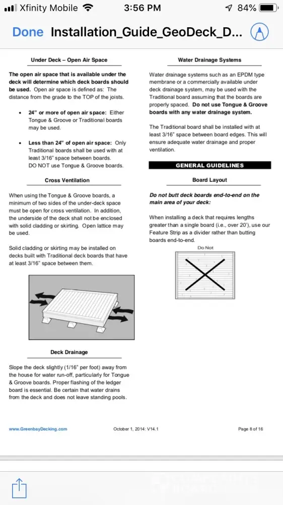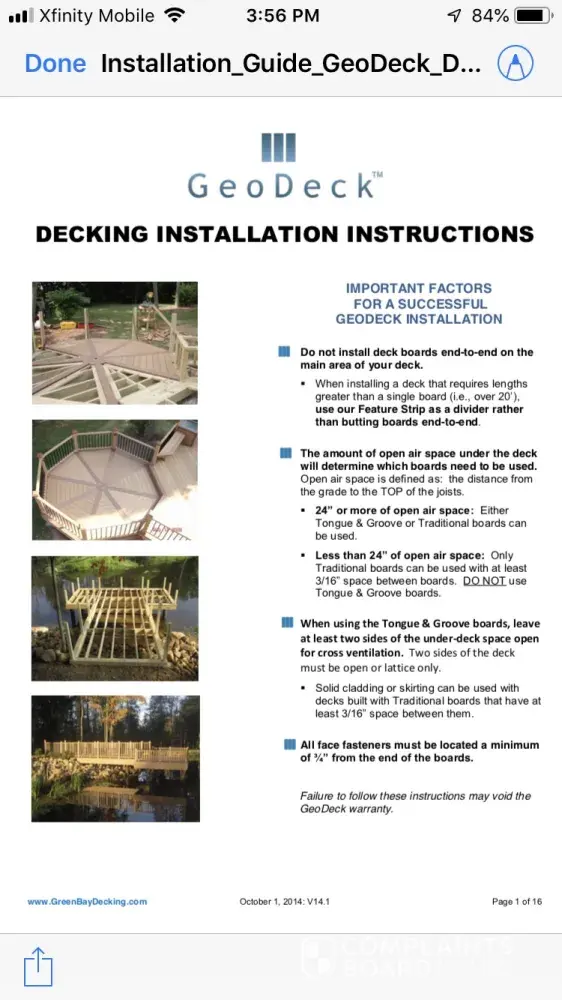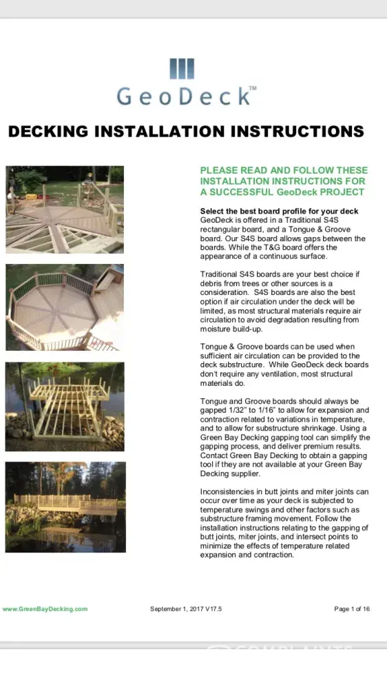 Had Geodeck installed July 2016, last year, only 2 years later, it began to buckle and split. Definitely a safety hazard. Green Bay Deck has decided it’s because of the installation. They sent me a copy of install guidelines but these were different than the ones on their website, I was informed they were revised. They do not stand behind their product and we even had a professional contractor install who only worked with Geodeck. Needless to say he’ll never use it again!