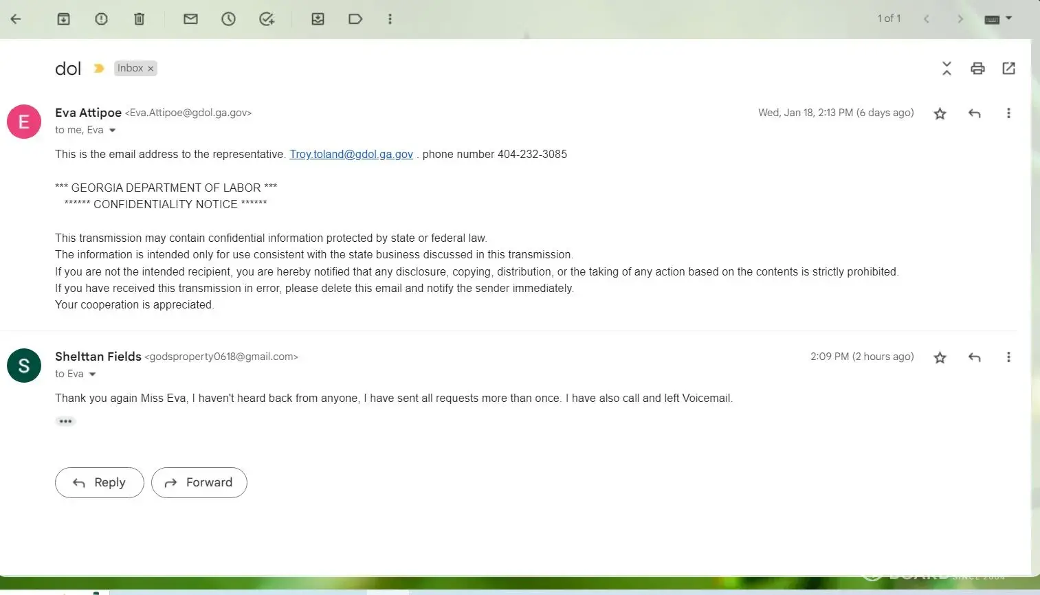 troy. [protected]@gdol. ga.gov. I reach out explain he had wrong number and all the questions that the rep said was needed, I gave full information companies name, no change full time and explained I was laid off in may 04/2022. I attached the seperation letter and the offer letter. This has been a real headache and stresful situation. I dont understand why he has not reach out, just denied my claim. I reach out to a labor lawyer that told me to try to reach out and clear this before he takes my case. I had death in family and I am out of town trying to handle this. I am upset how GA Dept of labor has been handling things. we the people have to suffer. [protected] Dwayne Fields last 4 is 7280