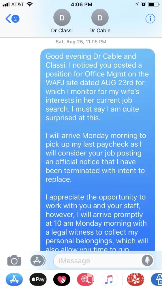 I also have a three-page notarized copy of my acknowledgement of my termination to my employer available, however, it is being reviewed/corrected by my attorney. I can make this available at any time. I also have a 6 page description of my grievances against this medical practice, also being reviewed by my attorney.