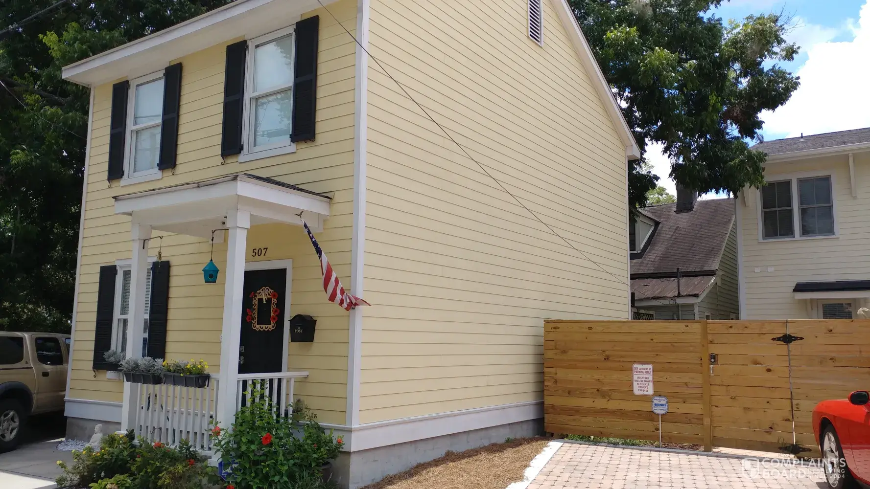 A lot of construction has happened in our area. After a townhouse was constructed on our west property boundary, we came home to find power lines on the pole installed without our permission. We requested that the pole be removed, a contractor showed up, and removed only the security light. We believe an easement was signed with and possibly payment made to the first owner of the yellow house at 507 Hall Lane, but the pole was never removed from our yard and put on his property. Fast forward several years, there are new neighbors in the yellow house who have become friends. The corner lot has been completely built on and we still have a pole in our yard.