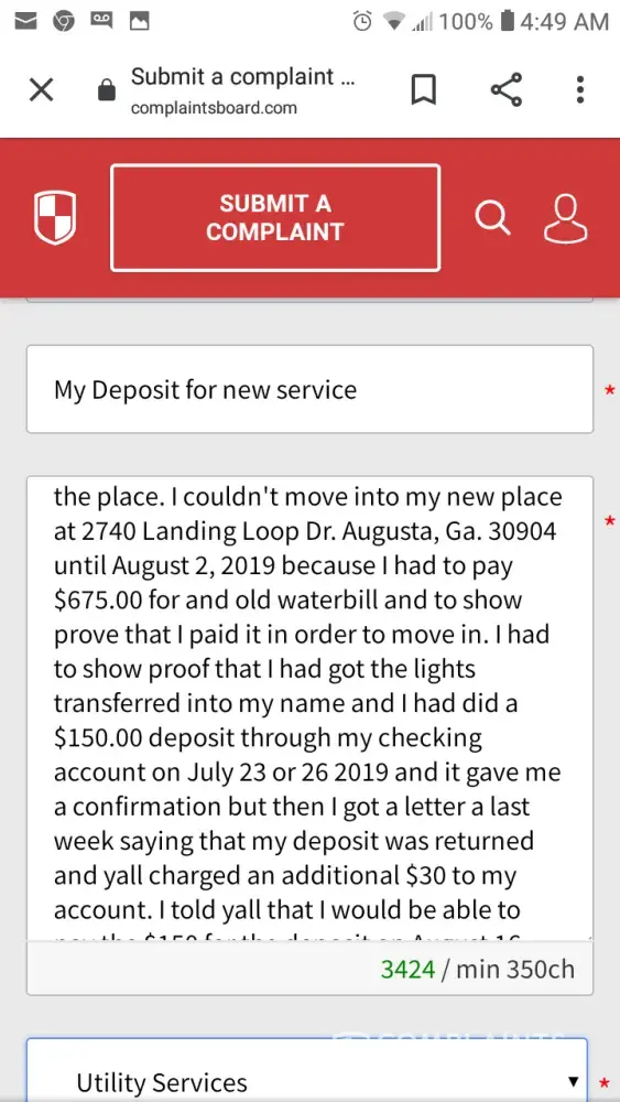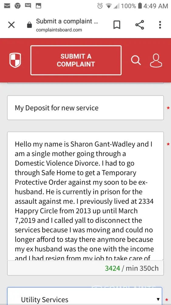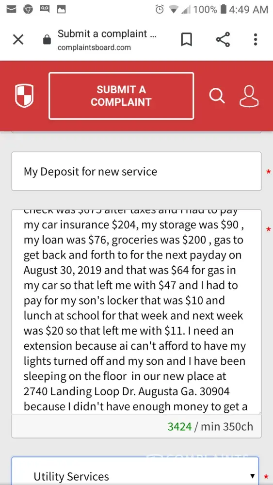 Hello my name is Sharon Gant-Wadley, I currently just move to 2740 Landing Loop Dr. Augusta, Ga. 30904. I previously lived at 2334 Happy Circle Rd. Augusta, Ga. 30906 and I moved from there on March 7, 2019. I couldn't afford to stay there anymore because I had resigned from work January 3, 2017 and my ex husband was the only one that had income coming in. My son and I was homeless from March 7, 2019 until August 2, 2019. I'm currently going through a domestic violence divorce. I had to go through Safe Homes a place for domestic violence victims and they helped me to get a Temporary Protector Order against him for the assault that he did to me. He is currently is in prison for the assault against me. I just got a medical release from my doctor to return back to work. I suffer from PTSD, bipolar, depression, anxiety and a victim of domestic violence. I'm greatful that I found a place for my son and I to stay in. I had got a refund for my deposit in April 2019 or May 2019 for $355.00. I had paid my deposit for $150 July 23 or 26 2019 through my bank and gotten a confirmation thinking that it went through but i received a letter last week saying that my bank returned the check and that you all adding an additional $30 plus $30 for the first bill and the $150 deposit totally $210.00. I'm just asking could you give me an extension until I get paid on August 30, 2019. When I got paid on August 16, 2019 I had to pay my car insurance $204 so I could get back and forth to work, pay an old waterbill for $675.38 so that I can have the water transferred into my name to move in so that was my whole check right there. I couldn't get a Uhaul truck to get our belongings out so my son and I are sleeping on the floor with our blankets, 2 pillows, 5 chairs, a few groceries and a tv. Our beds, furniture and everything else is still in the storage until I can get a Uhaul truck. I'm asking could you all give me an extension until August 30, 2019 when I get paid. I can't afford to have my lights turned off because I can't afford another deposit. Thank Sharon Gant Wadley [protected] or [protected]