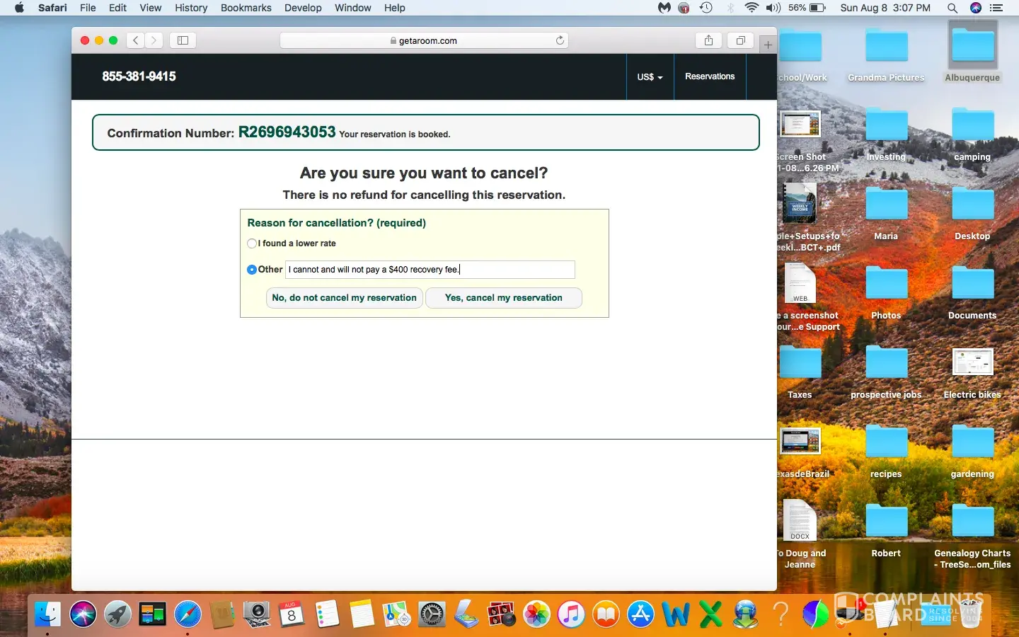 Unable to cancel reservation after being charged excessive recovery fees.