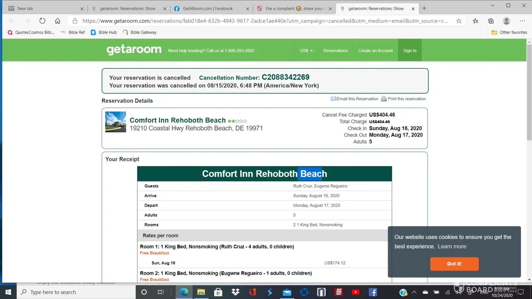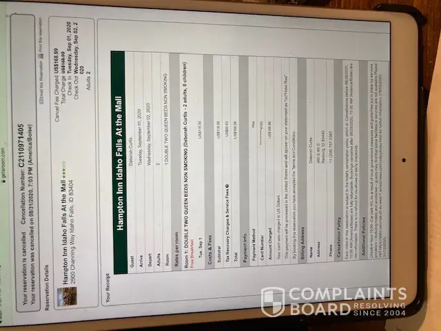 I booked (2) rooms with GetaARoom on 8/15/20 because I saw that they waived their cancellation policy if I chose to cancel on the date of booking. I did cancel within 40 minutes of booking and got sent an email with cancellation notice and indicating a slash through the amount that they charged. I noticed that I did not get the refund and when I called them they stated that they cant refund due to their cancellation policy. Please note that during the booking process they indicated that I could cancel on the date of booking without penalty. I notice that I am not the only one with this problem. I am working with the credit card company to dispute this charge but Getaroom is saying that their cancellation policy is no refund on this booking. I will be sending my emails via fax to the credit card company but this is a scam that Getaroom is running. They are lying to get reservations by stating no penalty if cancelled but still do charge a penalty fee for cancellation. Please help me with this matter as the amount if considerable ($400). Thank you