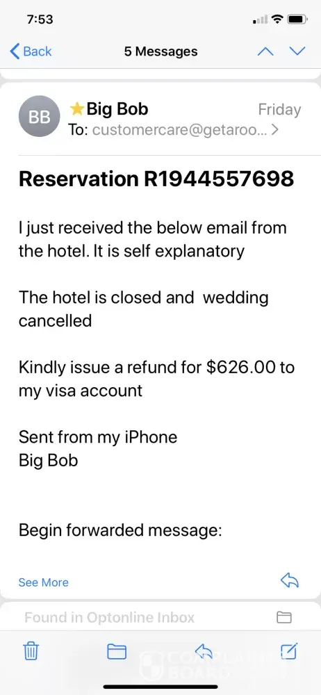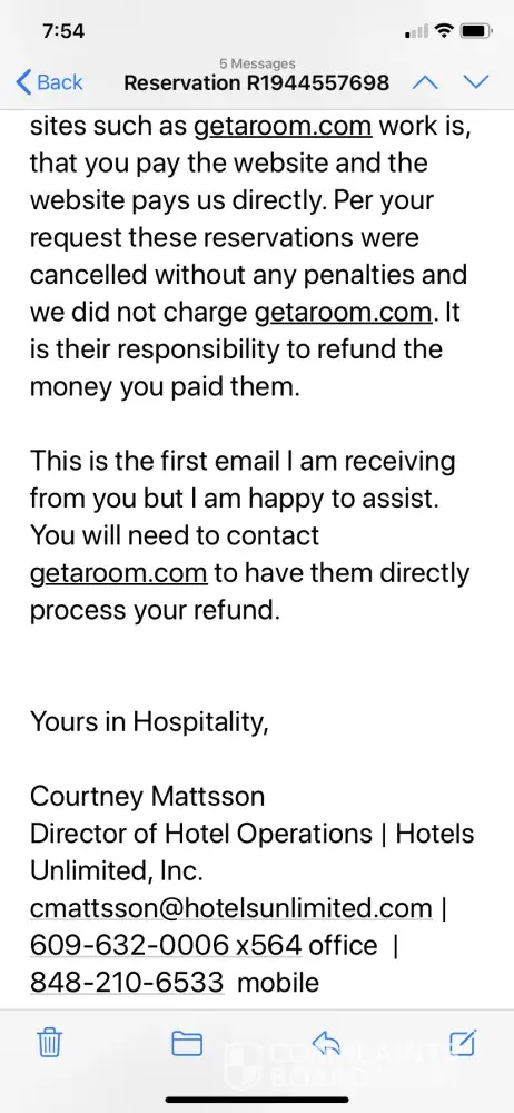 When I originally booked, I thought I was on the hotel website - it was deceptively created to look like I was booking directly with the hotel, which was my intention. The booking email confirmation came from [protected]@hotelvalues.com, and when I searched it, the site can't be reached. There is an effort to hide the fact that you have booked with Getaroom. The only way to know is by looking at your credit card statement to see where the charge comes from. I would like to hear back from the company and receive the refund as promised.